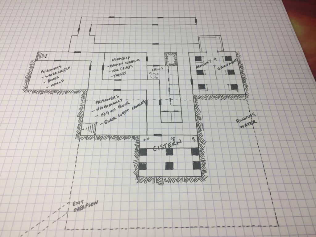 Moving quietly, the group decide to try the door nearest to the workshop before heading west. Mira leads, entering a long, thin room lined with cells. A small table and three stools have been placed close to the entrance.
